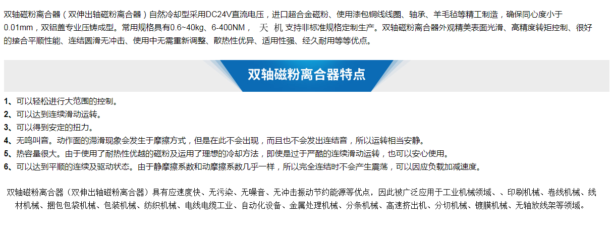 雙軸磁粉離合器(雙伸出軸磁粉離合器)自然冷卻型采用DC24V直流電壓,進(jìn)口超合金磁粉、使用漆包銅線線圈、軸承、羊毛氈等精工制造,確保同心度小于0.01mm,雙鋁蓋專業(yè)壓鑄成型。常用規(guī)格具有0.6~40kg、6-400NM,天機(jī)支持非標(biāo)準(zhǔn)規(guī)格定制生產(chǎn)。雙軸磁粉離合器外觀精美表面光滑、高精度轉(zhuǎn)矩控制、很好的接合平順性能、連結(jié)圓滑無沖擊、使用中無需重新調(diào)整、散熱性優(yōu)異、適用性強(qiáng)、經(jīng)久耐用等等優(yōu)點。